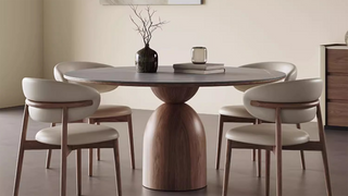 The JASIWAY round dining table exudes an irresistible charm inspired by the timeless aesthetics of the mid - century era. Its smooth, continuous curves create a sense of fluid grace, making it an instant focal point in any home kitchen. The harmonious blend of a sleek rock panel tabletop and a robust wooden base offers a visual treat, marrying the contemporary allure of rock panel with the warm, natural appeal of wood.