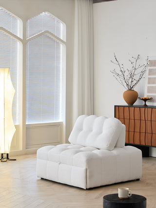 The Jasiway Lounge Sofa Bed features a sophisticated pull-out sleeper mechanism that sets it apart from traditional convertible furniture. The hidden dual-layer design allows the lower section to fold neatly beneath the top layer, creating a clean, compact profile when used as a sofa. This innovative system includes a durable carbon steel base with smooth dual-direction rollers that extend effortlessly while protecting your floors from scratches. The cream white teddy fleece upholstery adds a luxurious touch that feels as good as it looks, providing warmth and softness that enhances both seating and sleeping experiences. The four-layer cushioning system is meticulously designed to provide exceptional comfort and support. It starts with breathable air cotton, which promotes airflow to keep you cool and comfortable. Next is pressure-absorbing memory foam that conforms to your body, relieving stress on joints and muscles. This is followed by responsive violet foam, offering adaptive support and bounce for enhanced relaxation. Finally, high-density bamboo charcoal foam not only adds a firm, supportive base but also absorbs moisture and eliminates odors, ensuring freshness over time. All these layers are built on a solid wood internal frame, engineered to deliver long-lasting comfort, stability, and durability for years to come.