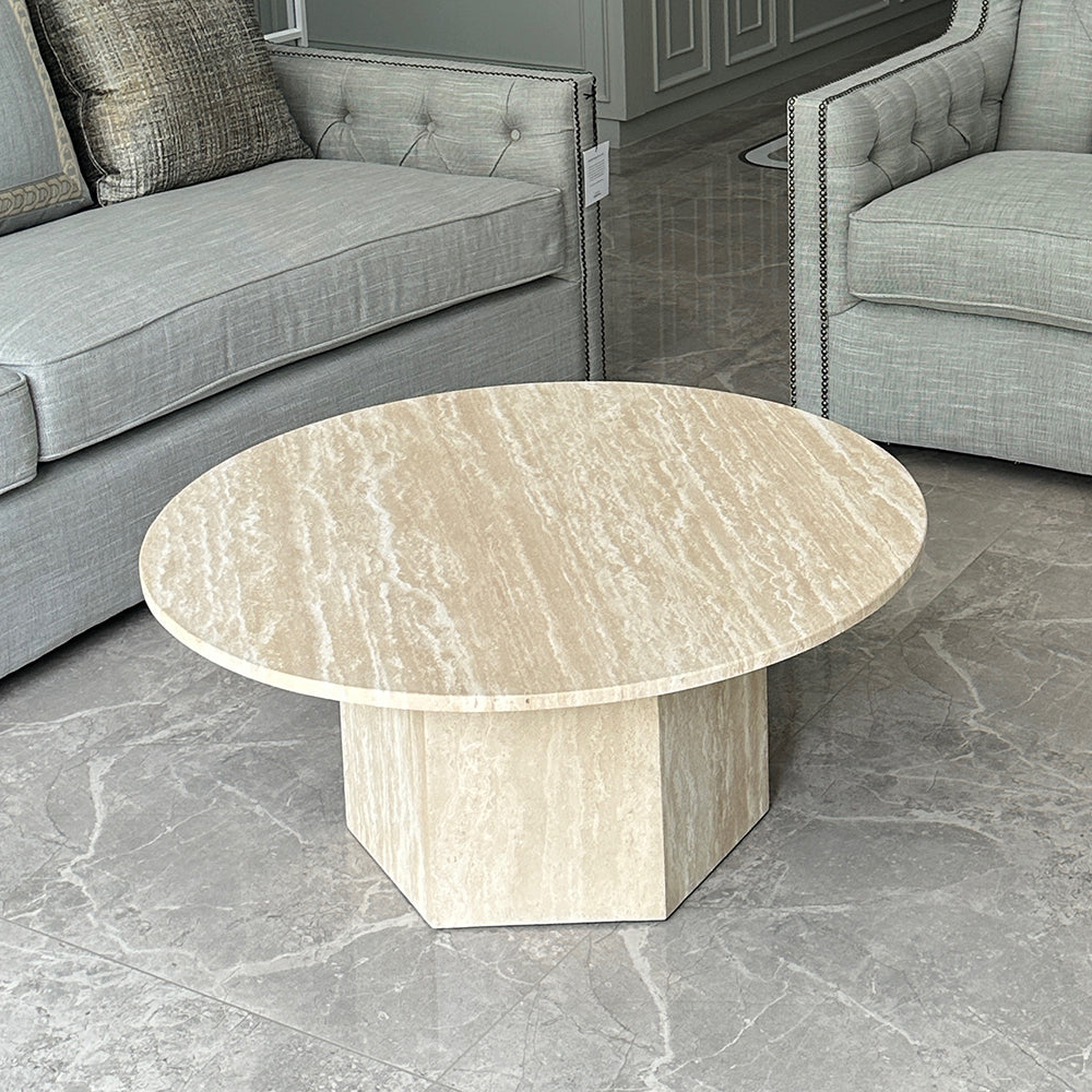 Crafted from premium beige travertine, this version features a unique natural grain, gentle earth tones, and a timeless texture often compared to marble—but softer in tone and uniquely patterned. A true travertine coffee table for those who appreciate the artistry of raw, organic materials. -