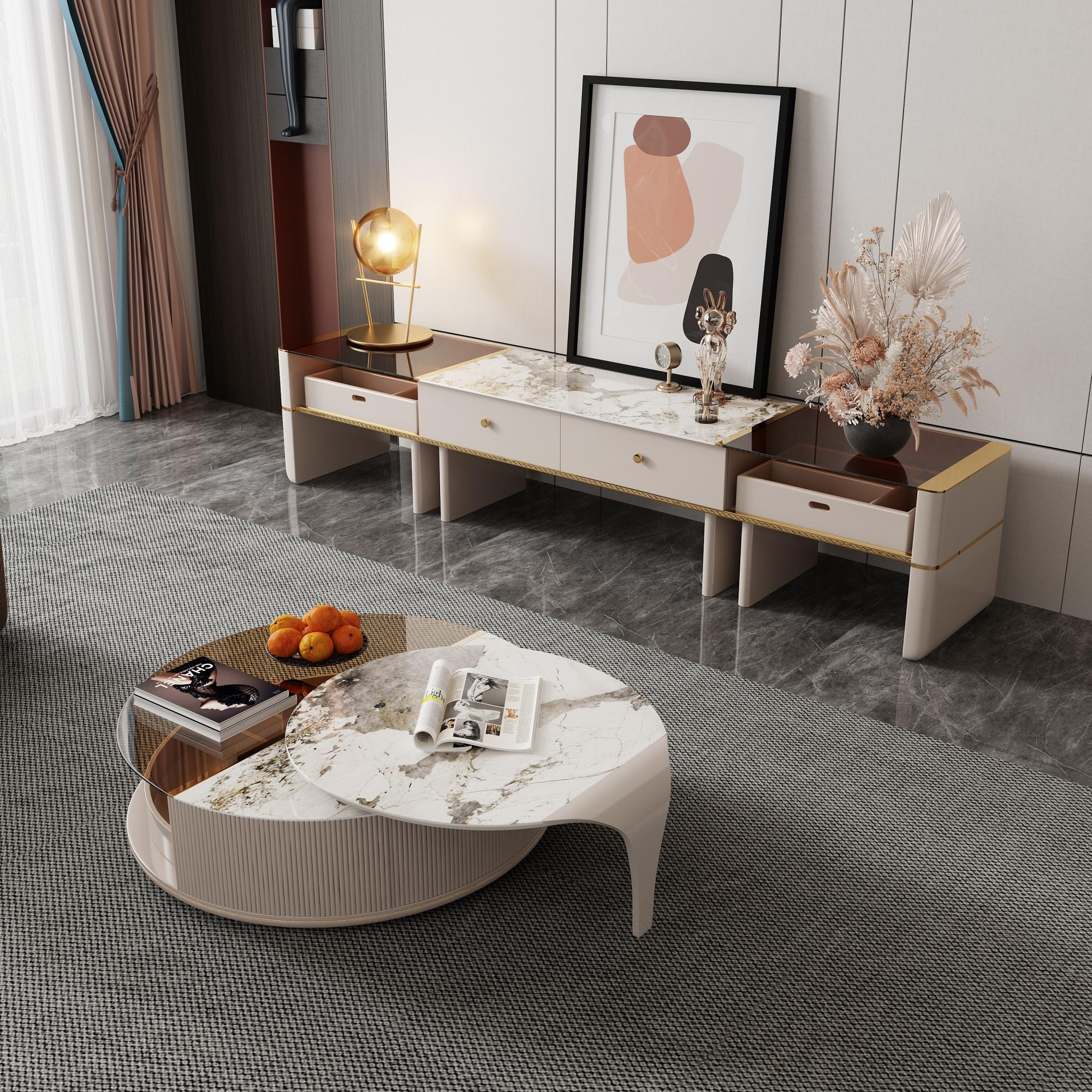 With clean lines and a glam finish, this coffee table set elevates your space with a bright, elegant look. The sintered stone and glass table top provides just the right space to display your favorite centerpiece or entertainment essentials to keep your room clutter-free. Meanwhile, simple construction fits any style of the living room or other small space well. This coffee table can match with same series TV stand together.Don’t hesitate and get one.