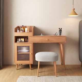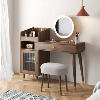 Crafted from high-quality multi-layer plywood for the tabletop and storage units, this modern makeup vanity is built to last. The solid wood legs ensure durability and stability, while the tempered glass cabinet door adds a touch of sophistication. Choose from three elegant color options to match your style: