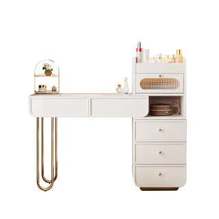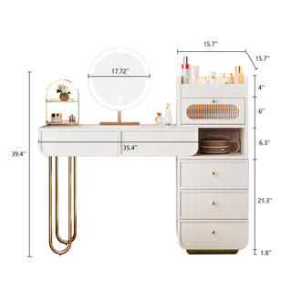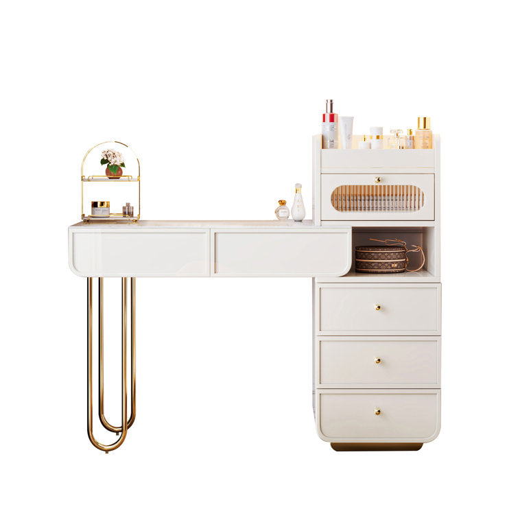This makeup vanity is the perfect choice for the bedroom.White color, bright sintered stone table top, durable. Equipped with a multi-functional storage side cabinet and top cabinet, multiple drawer design, and large space capacity, can easily store all kinds of cosmetics. Drawers with smooth guide rails and delicate metal handles. Tabletop rounded corner design effectively prevents knock injury. The table is mainly made of high-quality MDF, and the foot of the table is made of stainless steel, which is not easy to fade and deform.