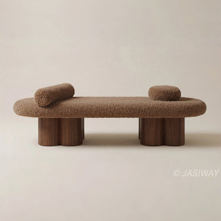 Material choice defines the character of each RINGCHEN bench. Soft, tactile fabrics such as bouclé upholstery bring warmth and depth, while solid wood foundations—often finished in rich walnut tones—add structure and longevity. These carefully paired elements create sculptural benches that feel grounded, timeless, and quietly expressive.