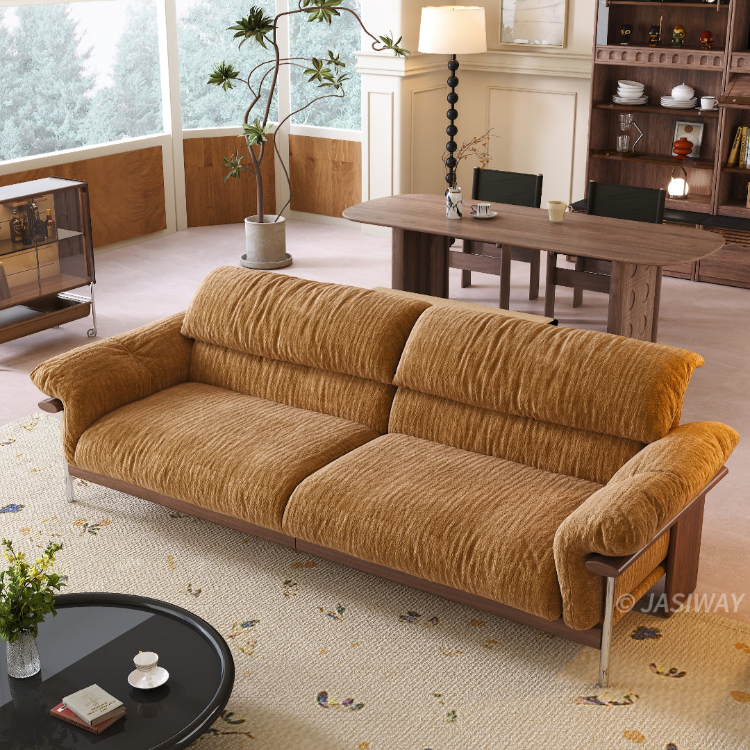 Bring timeless design and everyday comfort together with this mid century modern sofa, thoughtfully designed for contemporary homes. Upholstered in richly textured chenille and framed with elegant walnut wood, this retro modern chenille couch blends vintage character with modern durability. Whether placed in a spacious family room or a stylish apartment, this modern chenille sofa for living room creates a warm and inviting centerpiece.