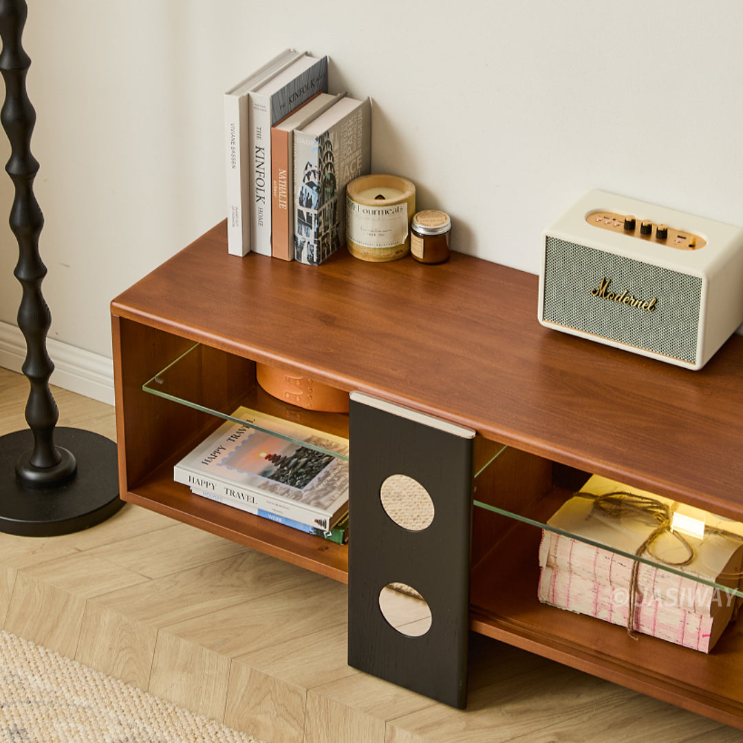 Inspired by classic mid-century modern furniture, this wooden TV cabinet with doors showcases a balanced silhouette, slim proportions, and natural textures. Available in walnut and boxwood finishes, it works beautifully as a walnut TV stand, walnut media console, or lighter-toned accent piece depending on your space.