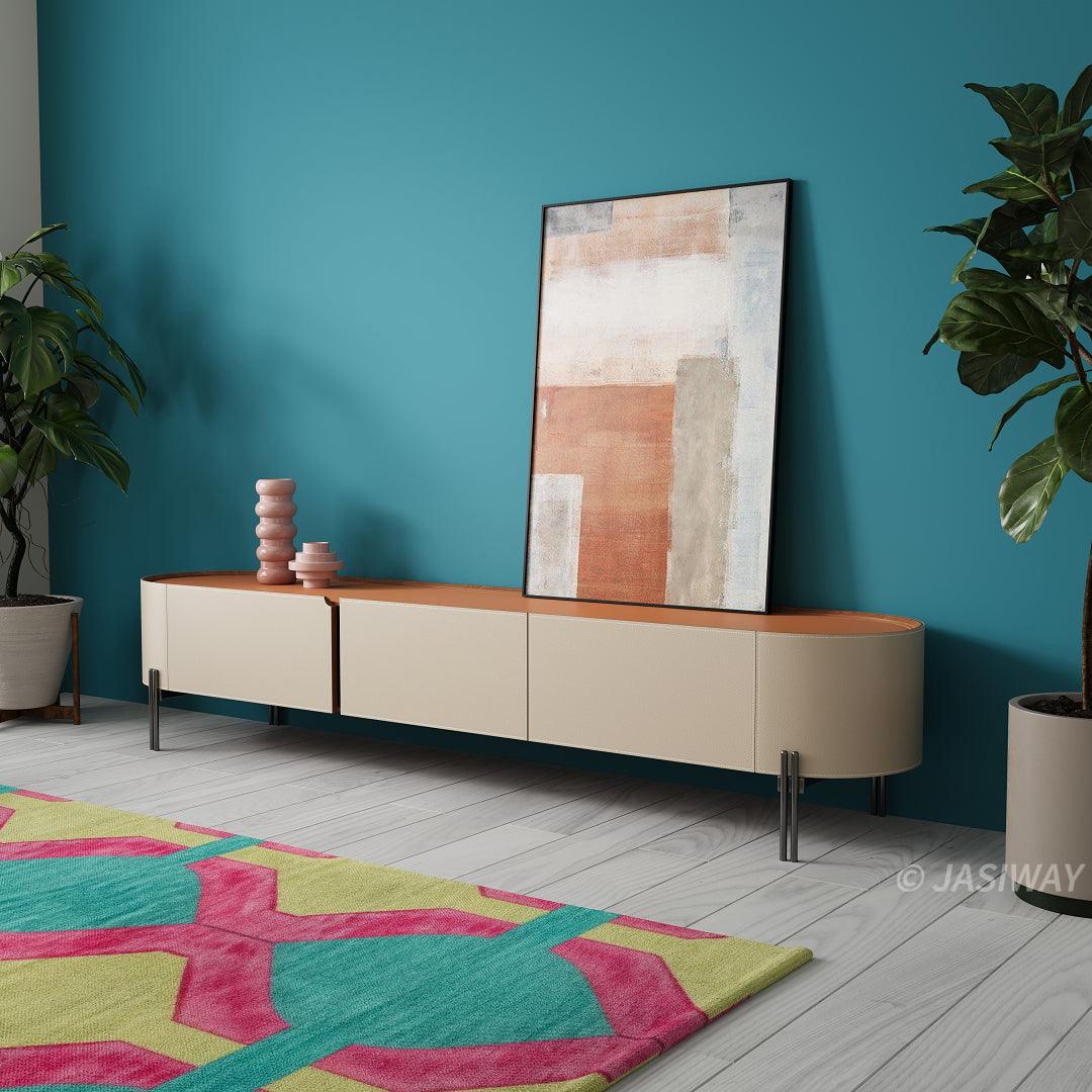 Smooth rounded edges enhance visual harmony while allowing the cabinet to integrate naturally alongside sofas, coffee tables, and lounge seating. As a curved leather TV stand, it becomes more than functional furniture — it acts as a sculptural centerpiece that elevates the entire living room environment.