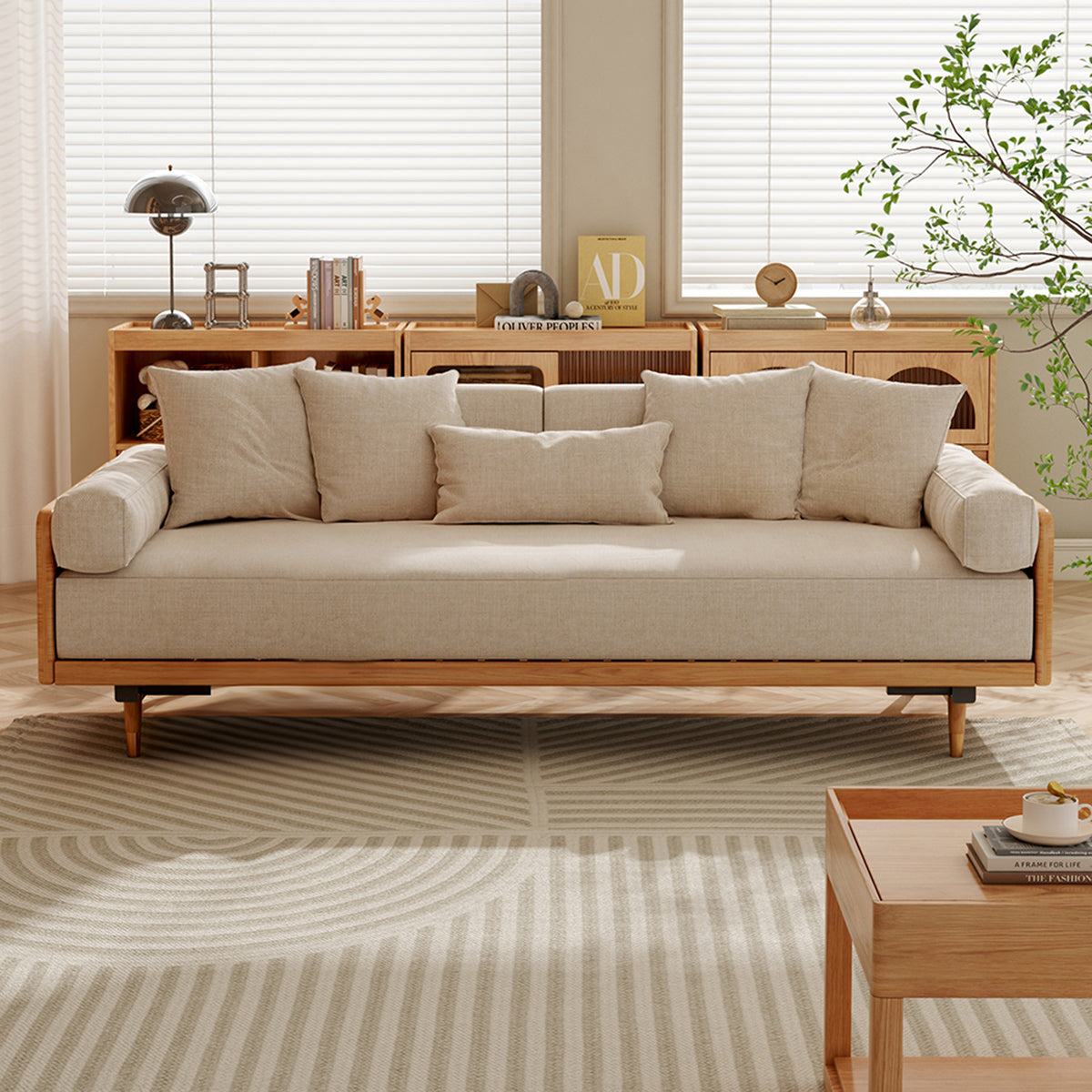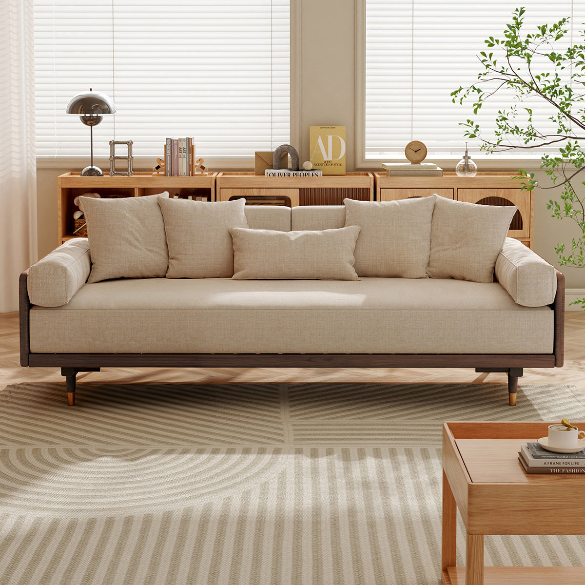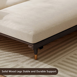 The clean lines and simple elegance of this modern sofa bed reflect the harmony of Scandinavian functionality and Japanese minimalism. Designed to fit seamlessly into any space, it brings a sense of tranquility and style to your living room, guest room, or home office. The walnut color frame and soft, breathable cotton-linen fabric elevate the overall design, creating a welcoming atmosphere wherever it's placed.