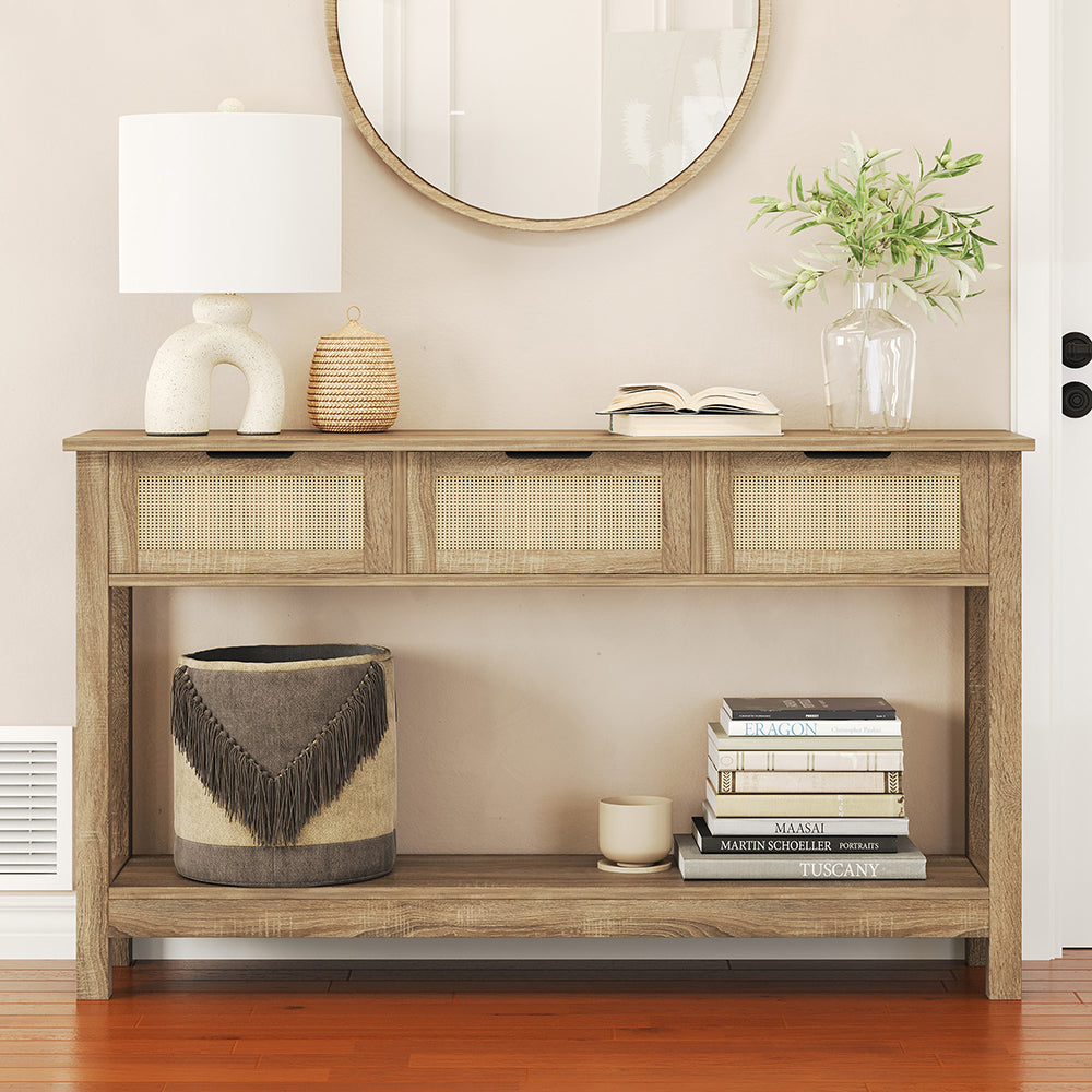The natural wood grain finish and textured rattan detailing bring a bohemian charm that complements farmhouse, rustic, and modern décor styles. Measuring 47.24″ × 11.81″ × 32″, it works beautifully as an entryway organizer, slim hallway or sofa-back table—even as a compact desk in tighter spaces.