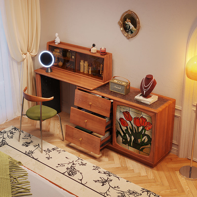 JASIWAY Art Deco Solid Wood Vanity Desk with Stained Glass-Style Tulip Accent | Extendable, Corner-Fit Makeup Vanity with Storage & Drawers