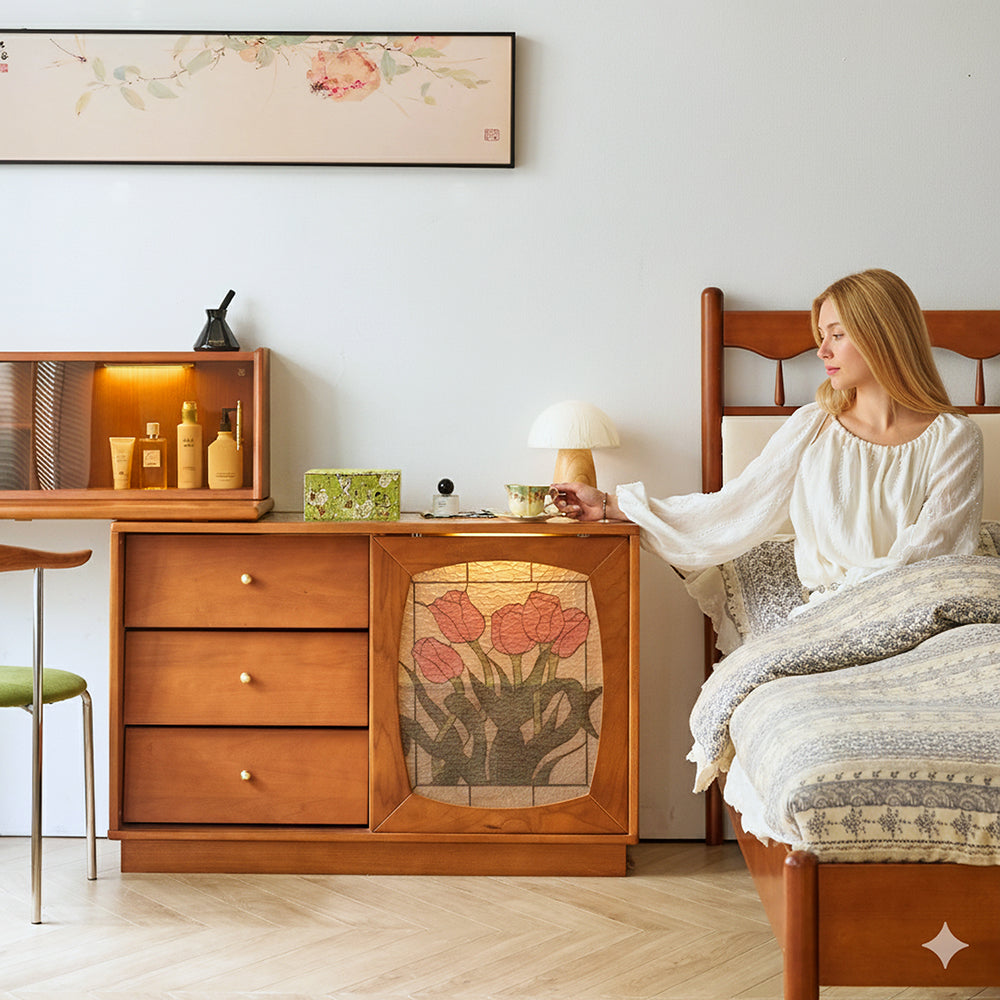 Picture yourself sitting by the softly lit tulip panel, a warm cup of coffee in hand, as sunlight filters through your window — this dressing table with tulip glass accents is more than furniture; it’s an experience.