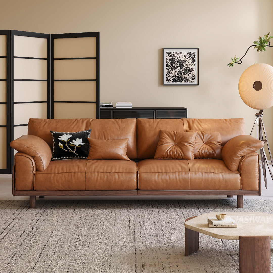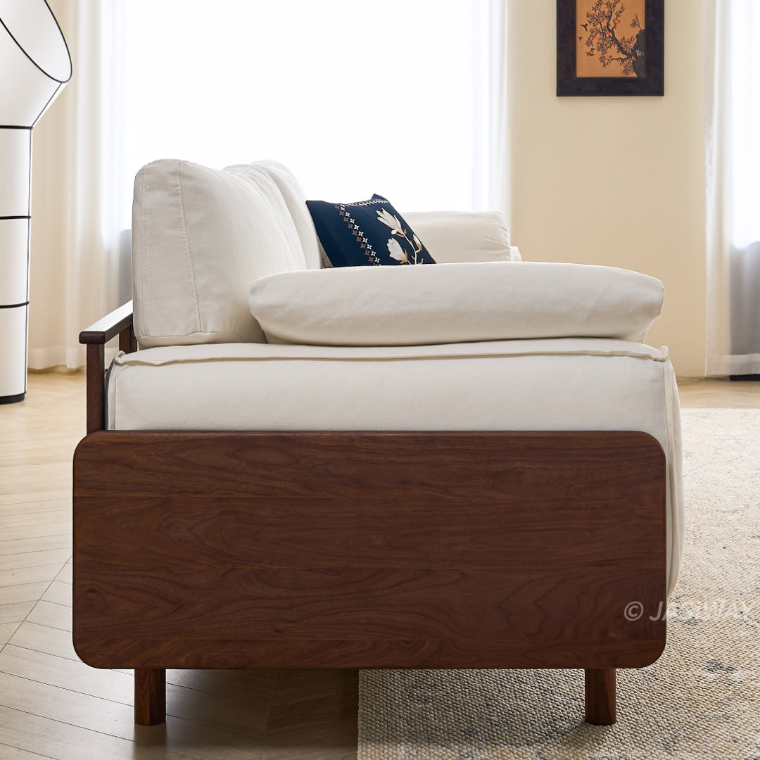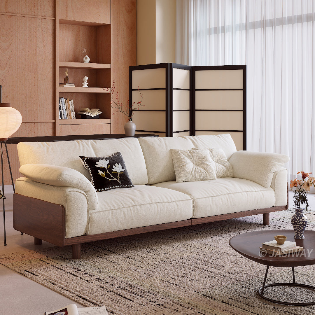 | Features | A modern Japandi sofa with walnut wood frame, deep seat comfort, anti-slip seat design, and premium fabric or top grain leather options |