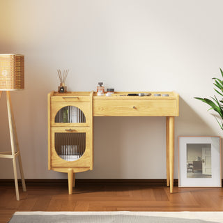 A spacious drawer keeps your daily essentials neatly hidden, while the side cabinet with stylish rounded glass doors provides easy access to larger items or decorative pieces. -